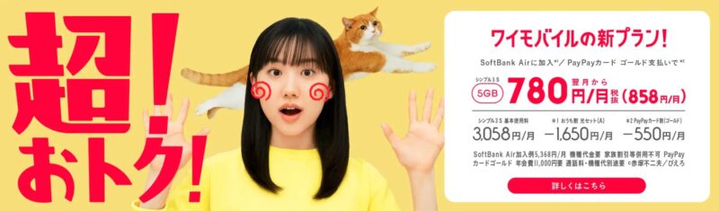 ソフトバンク系の安定通信と、PayPay連携によるキャッシュバックで家族・学生からの支持が高い。メイン回線としても十分使える品質です。ワイモバイル公式サイトはこちら